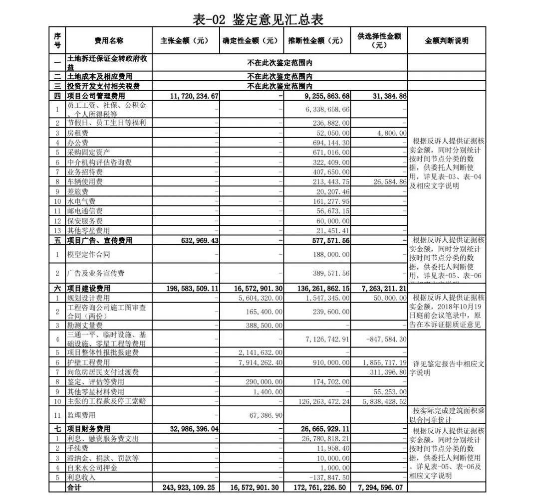由于本項(xiàng)目涉及費(fèi)用項(xiàng)目、金額均較大,《鑒定意見(jiàn)書(shū)》中分別根據(jù)證據(jù)情況、國(guó)家文件規(guī)定、解除合同時(shí)間等分類方式,逐項(xiàng)對(duì)金額進(jìn)行了分類,并附加相關(guān)說(shuō)明,為法庭判決提供了數(shù)據(jù)支撐。最終鑒定確定性金額16,572,901.30元,推斷性金額172,761,226.50 元,供選擇性金額7,294,596.07 元,具體詳表-02