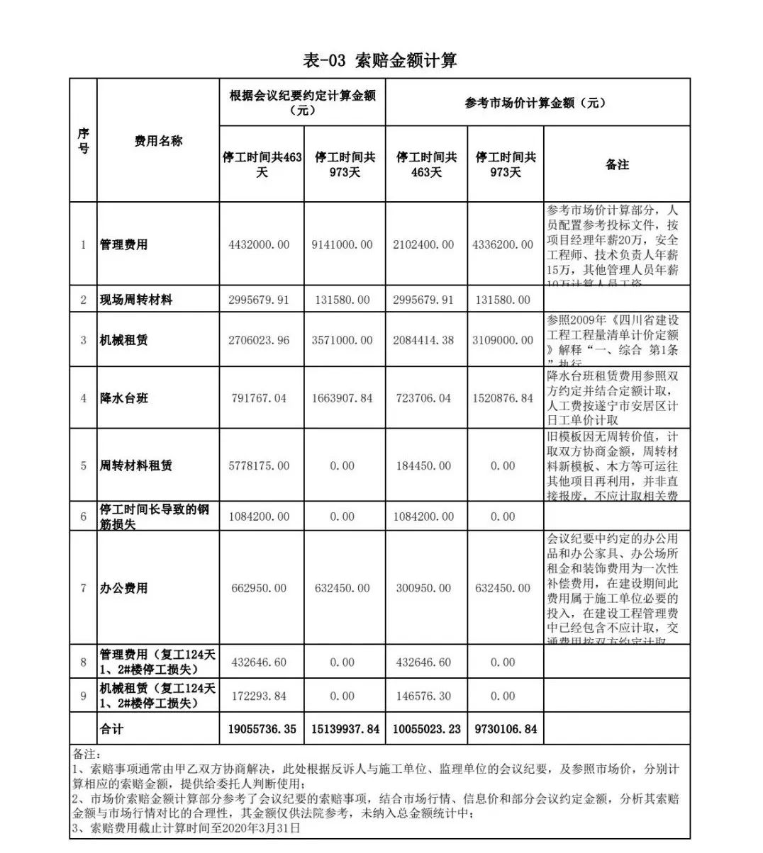 政府與開(kāi)發(fā)公司之間的合同已解除,但鑒定時(shí),開(kāi)發(fā)公司與施工單位之間簽訂的施工合同并未解除。項(xiàng)目公司管理費(fèi)的時(shí)間節(jié)點(diǎn)判定就成了一個(gè)難題。鑒定人經(jīng)多次內(nèi)部討論,最終確定:將項(xiàng)目公司管理費(fèi)列為推斷性金額,且根據(jù)不同方案分別統(tǒng)計(jì)金額,提交法院參考(具體數(shù)據(jù)詳表-03):