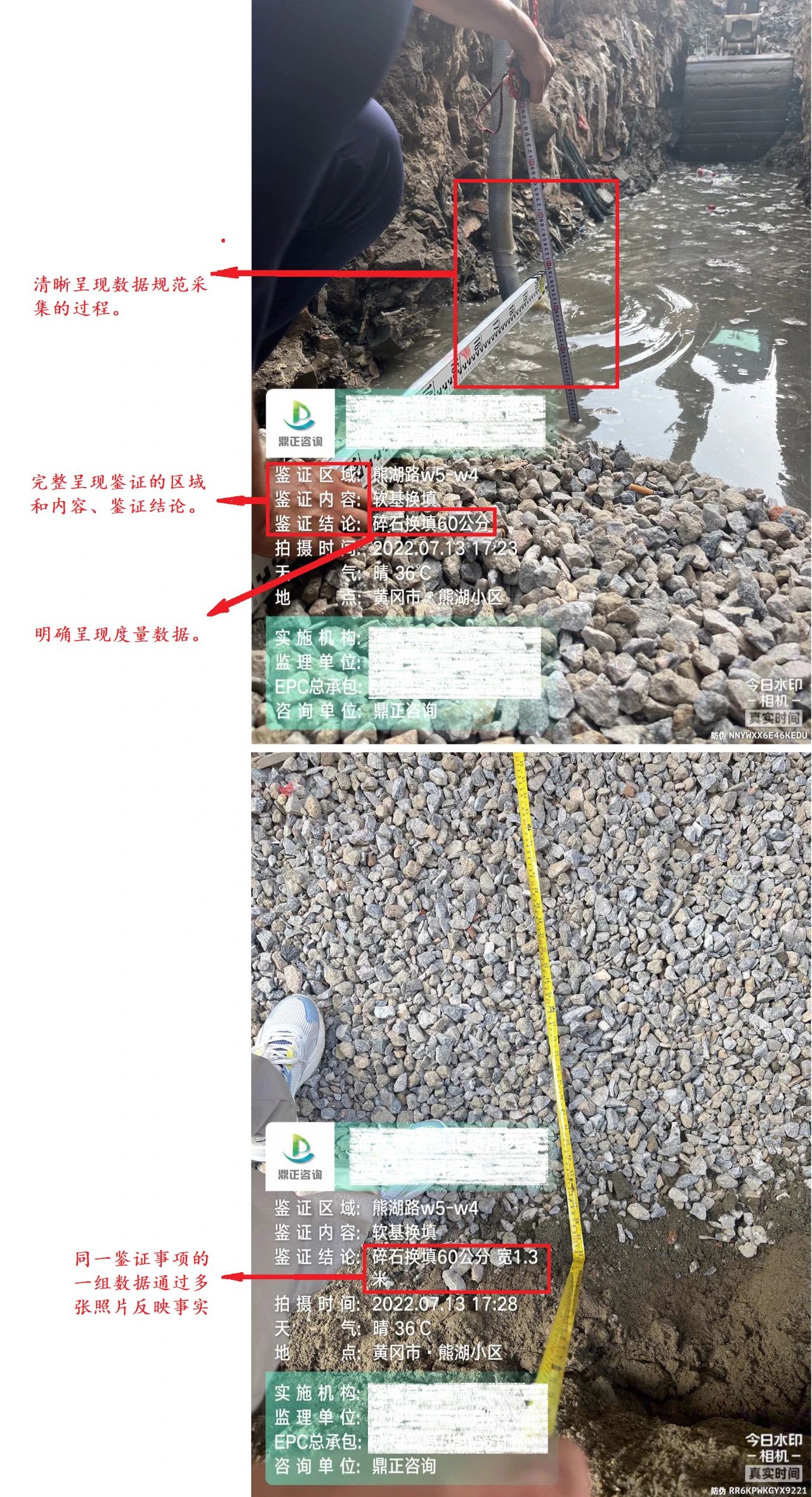現(xiàn)場鑒證照片是再現(xiàn)工程現(xiàn)場施工質(zhì)量、安全、隱蔽工程等實際施工情況的重要證據(jù),是各項目施工階段工程監(jiān)理、全過程造價咨詢、結(jié)算審核以及解決工程糾紛提供有價值的支撐材料,是筑好每一個項目,夯實鼎正服務(wù)品質(zhì)的基石。