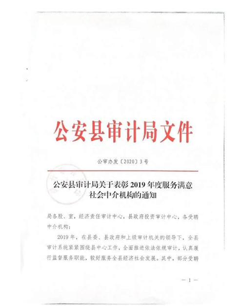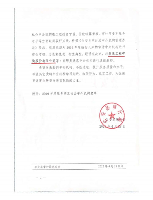 自2019年7月1日鼎正咨詢成為公安縣審計局的入庫合作單位以來,荊州分公司同事們在工程竣工結(jié)算審計過程中,精心組織、合理安排、嚴于律己、廉潔從審,在確保重點工程順利推進、節(jié)約政府資金、提高投資效益等方面做出了突出貢獻,得到了公安縣相關(guān)單位的一致好評,為公司贏得了信譽。
